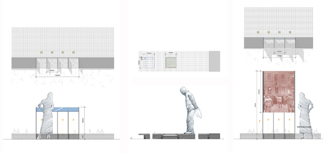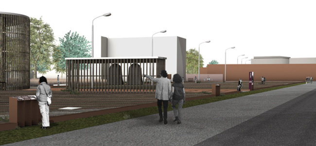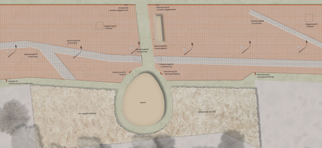 Gemeinsamer Wettbewerbsbeitrag von Landschaftsarchitekten, Architekten und Ausstellungsdesignern. Das neue Denkmal wird von einer Gitterrost-Ebene gebildet, die über die Fläche des ehemaligen Mauerstreifens gelegt wird. Sie nimmt Relikte der alten Grenzanlagen auf, bildet sie als Intarsien ab und wird damit zur Informations- und Besucherebene - sie schützt durch ihre abweisende Oberfläche aber auch die originale Substanz der Grenzanlagen vor der drohenden Vereinnahmung durch alltägliche Nutzungen.
